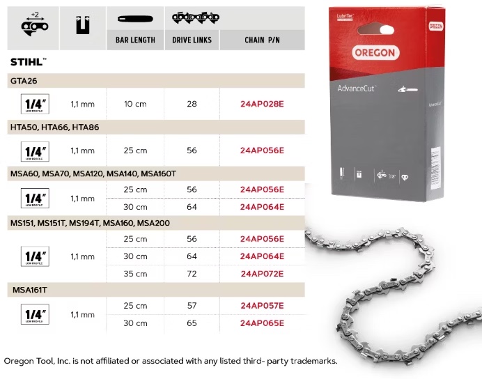 Original Oregon Motorsågskedja 24AP056E till tex batteridrivna grensågar.  Kedjedelning: 1/4" LP Spårbredd: 1,1mm Antal drivlänkar: 56