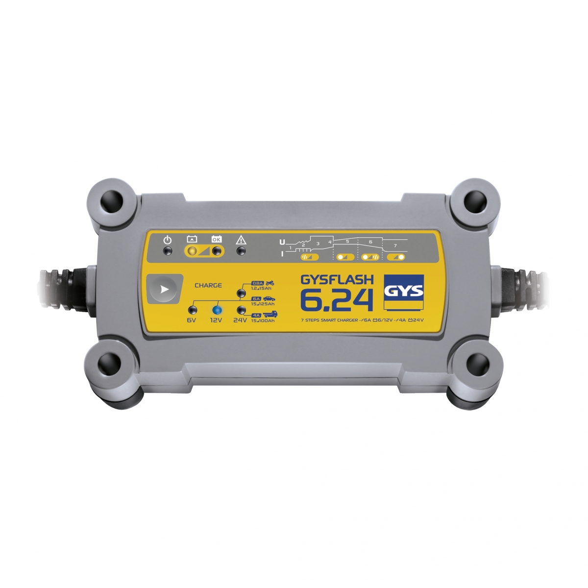 GYSFLASH 6.24 är speciellt utformad för att ladda alla typer av 6, 12 och 24V batterier som motorcyklar, bilar, SUV eller veteranbilar. Den har en 7-stegs intelligent laddningskurva för optimal laddning samt ett specifikt läge för att ladda batterier med mindre kapacitet upp till 15 Ah