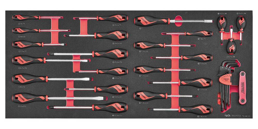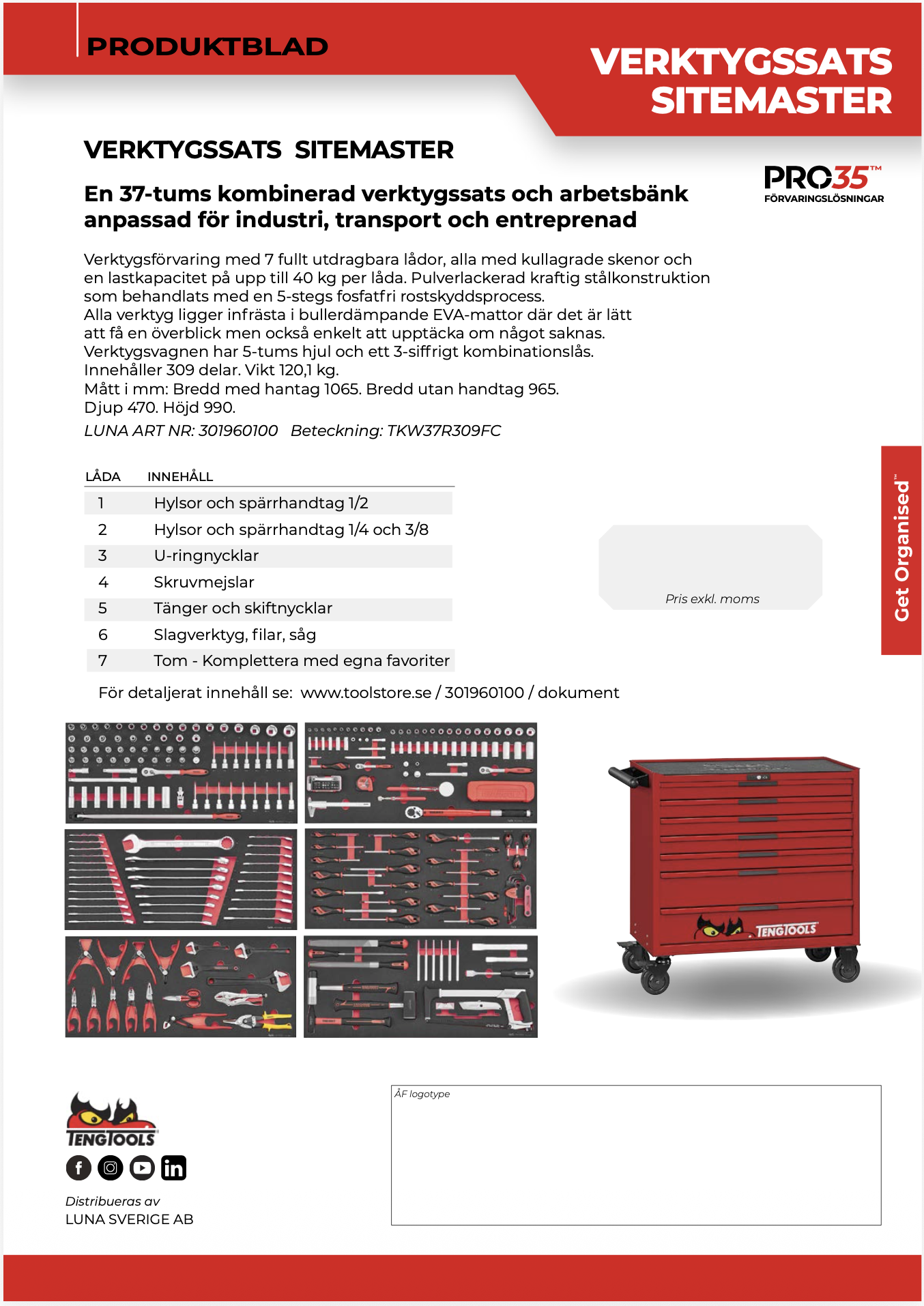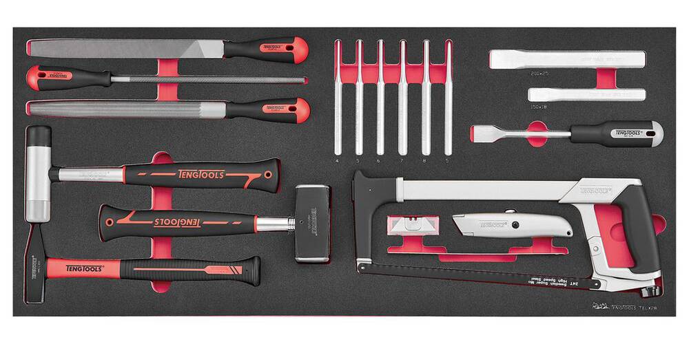VERKTYGSSET TENG TOOLS RÖD 37 TUM FOAM SITE 309 DELAR. Beskrivning 37'' verktygssats och arbetsbänk med 309 delar avsedd för industrin, lastbilar och anläggningsmaskiner.
