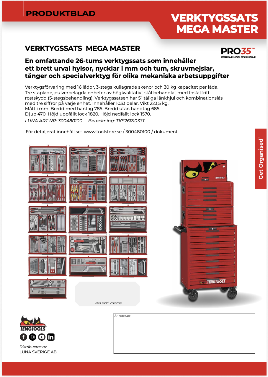 VERKTYGSSET 1033 DELAR. Teng tools röd 26 tum från Luna. Ett bra val för dig som söker verktygssats med tydlig produktinformation.